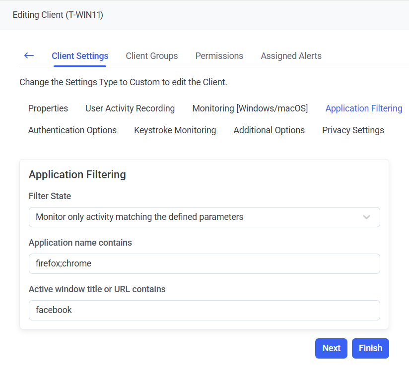 7. On the Application Filtering tab, define the Application Filtering parameters for the Client.