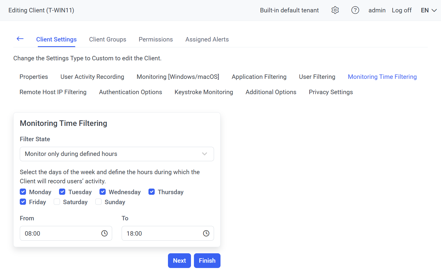 9. On the Monitoring Time Filtering tab, define the Monitoring Time Filtering parameter for the Client.