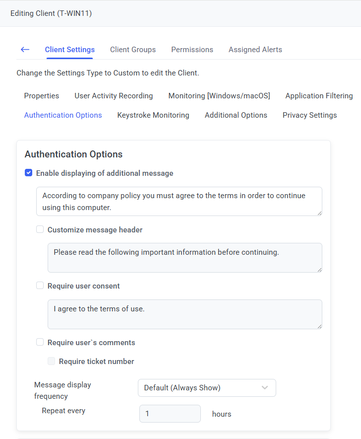 - Select the Enable displaying of additional message checkbox if you want to an additional message on user login to be displayed to the user, and also: