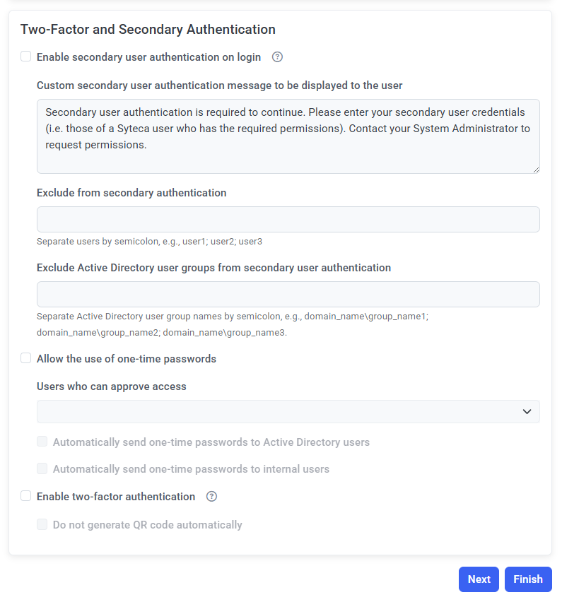 NOTE: The "Enable secondary user authentication on login" and the "Allow the use of one-time passwords" options cannot be used together, as neither of them will function correctly if both of these checkboxes are selected.