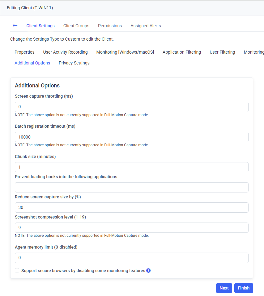 - Select the Enable file upload monitoring checkbox to enable detection and monitoring of File Upload operations performed on the Client computer.