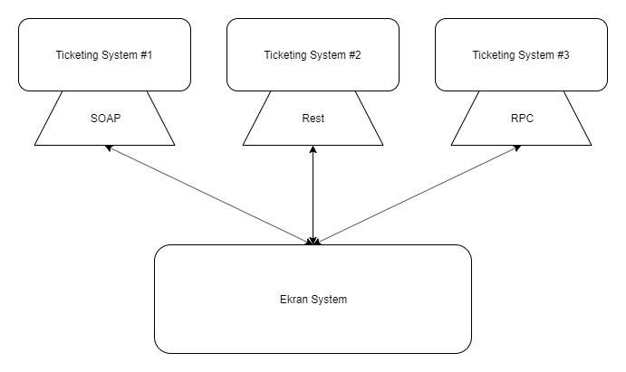 The design had to resolve the following issue: The general scheme shown has one major design flaw, in that it is difficult to maintain many different ticketing systems as they all have different APIs, and each time a new ticketing system is added, a new adapter must be written to work with each specific API.