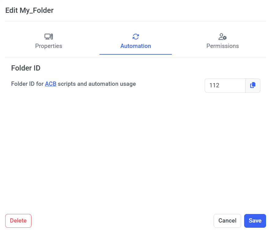 Similarly, the Folder ID of an existing folder can be viewed (and copied) while editing a folder, on the Automation tab (where the Folder ID is also required to use the ACB API, for getting and managing the folder's data).