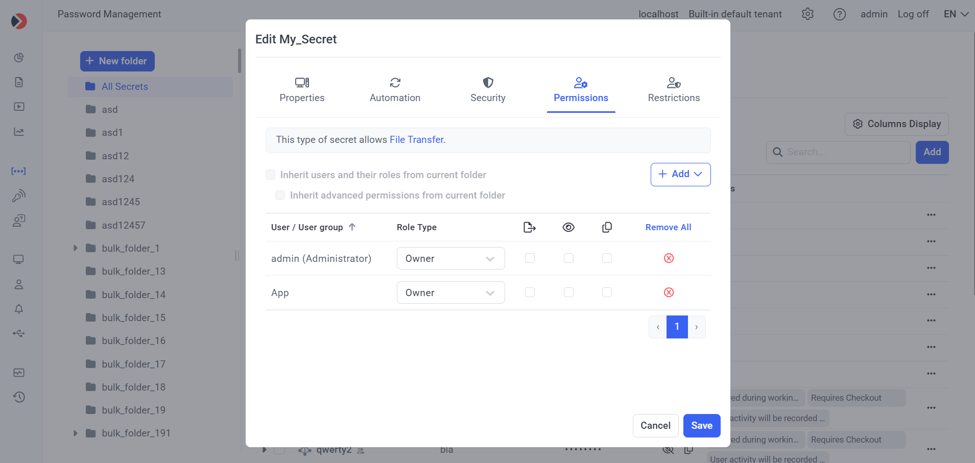 NOTE: The default "admin" user of the system has the Owner role for all secrets and folders created via the new (see below) endpoints (even if the default "admin" user is not added to the list of users on the Permissions tab of a secret or folder).