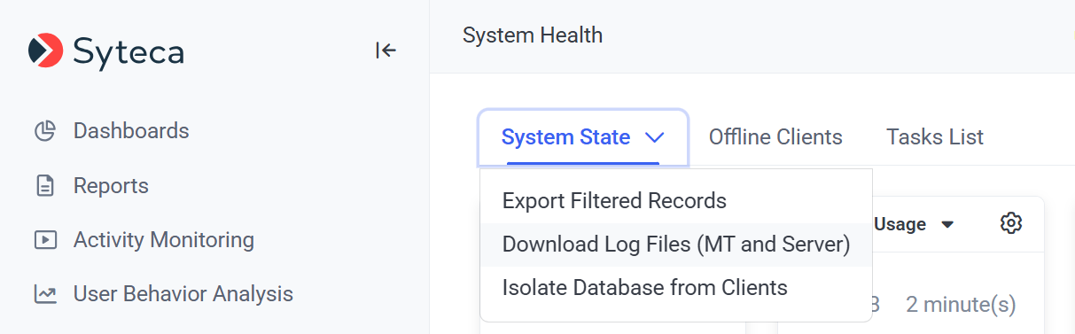 To download the Application Server log files from the Management Tool, open the System Health page, and click the System State .png?inst-v=dd718f50-0025-440c-84b5-70bd5d1e852d)
