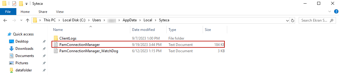 The Syteca Connection Manager logs can be found in the following folder: C:\Users\<user>\AppData\Local\Syteca