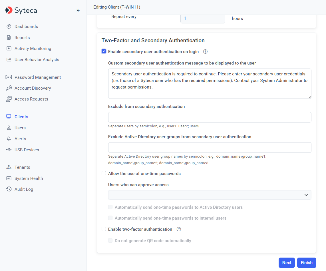 Secondary user authentication can be enabled by editing a Windows Client (or a Client group) configuration.