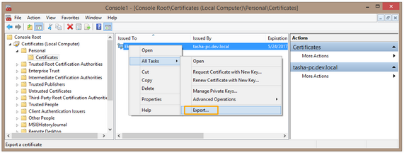 9. Select the master certificate used for signing the monitoring data in the database, and in its context menu select All Tasks > Export.