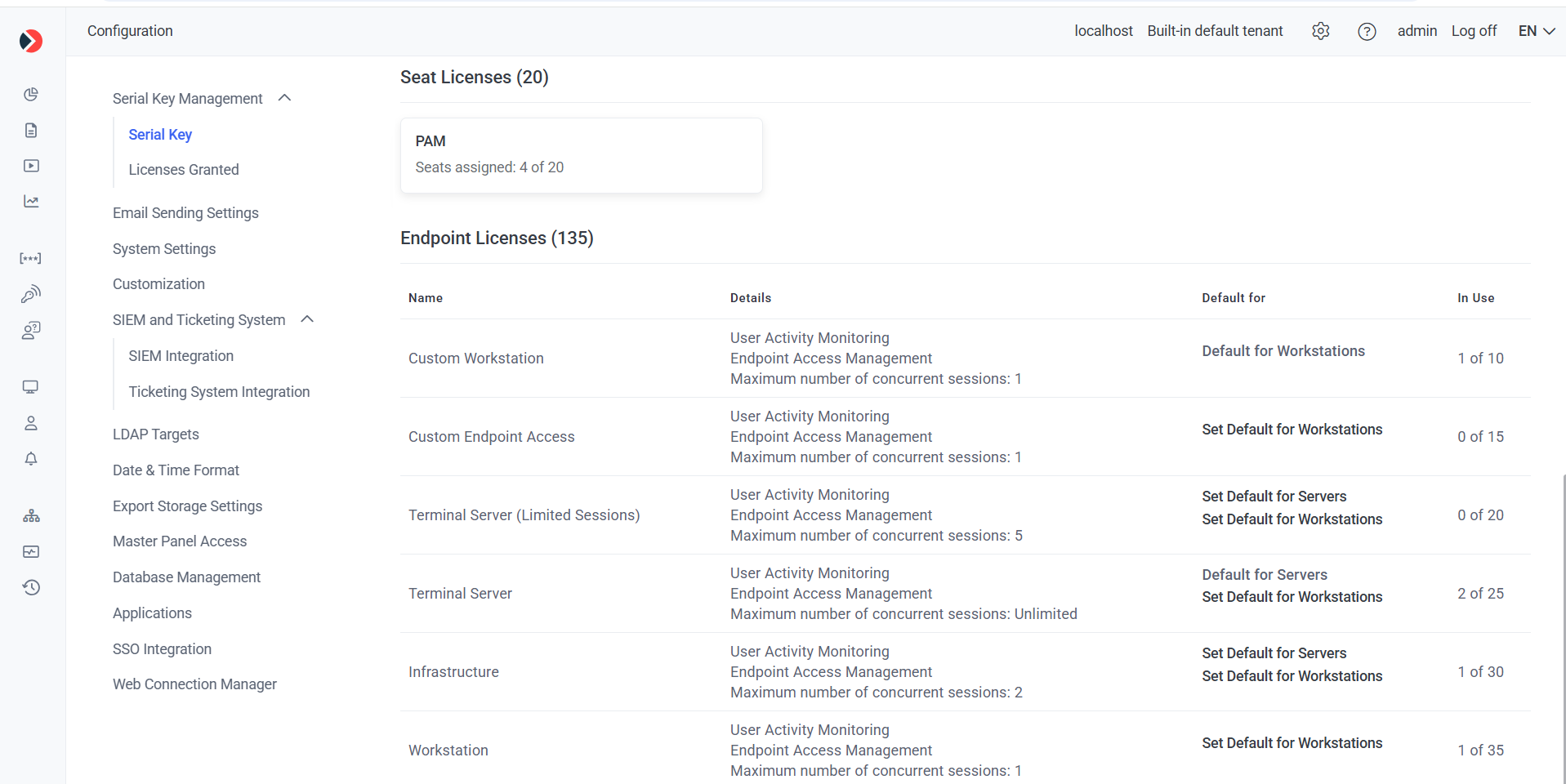 Information about the different license types contained in the serial key (and how many of each type are currently assigned of the total number available) is displayed in the Seat Licenses and Endpoint Licenses sections (at the bottom of the page).