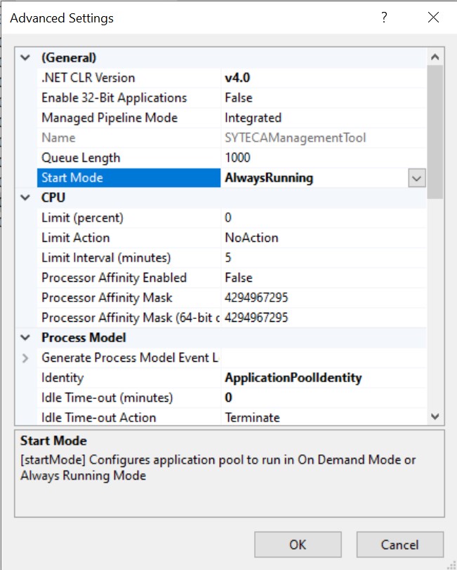 2. In IIS Manager, set Start Mode to "Always Running" for the SYTECAManagementTool application pool, by doing the following: