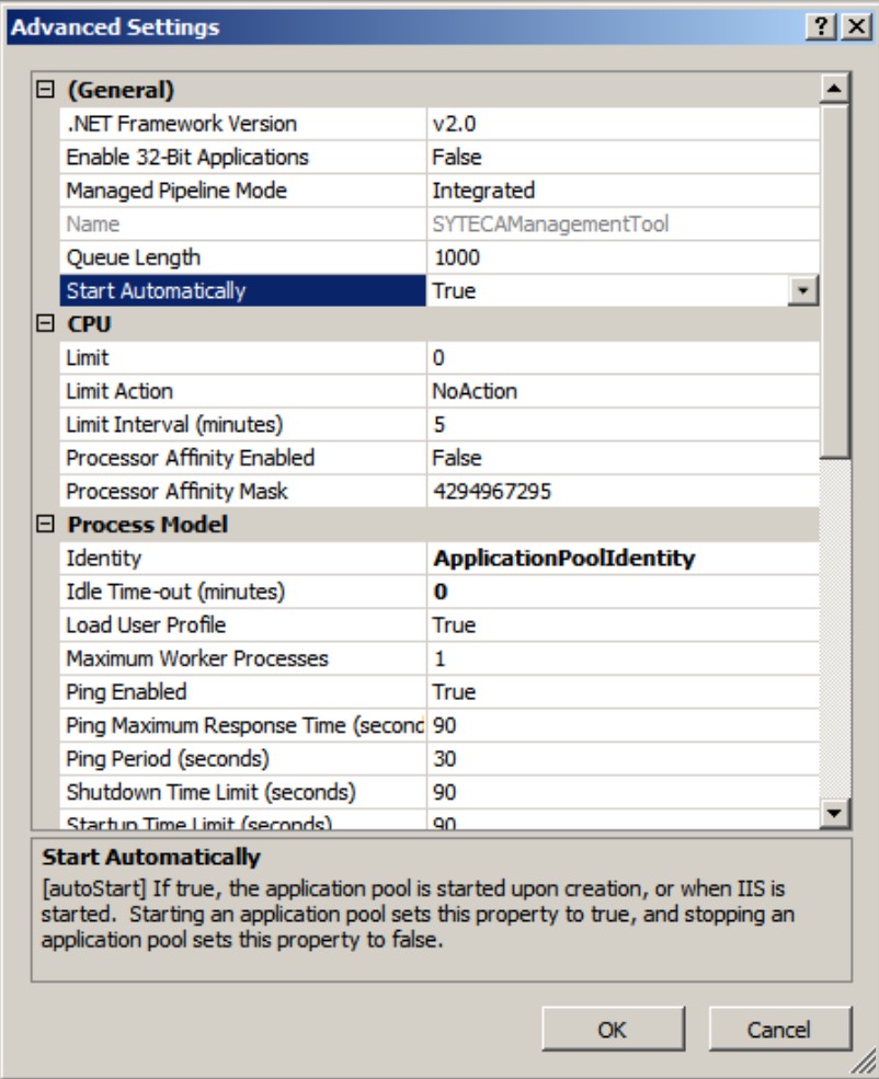 2. In IIS Manager, set Start Automatically to "True" for the SYTECAManagementTool application pool, by doing the following: