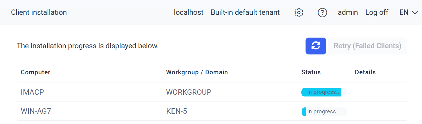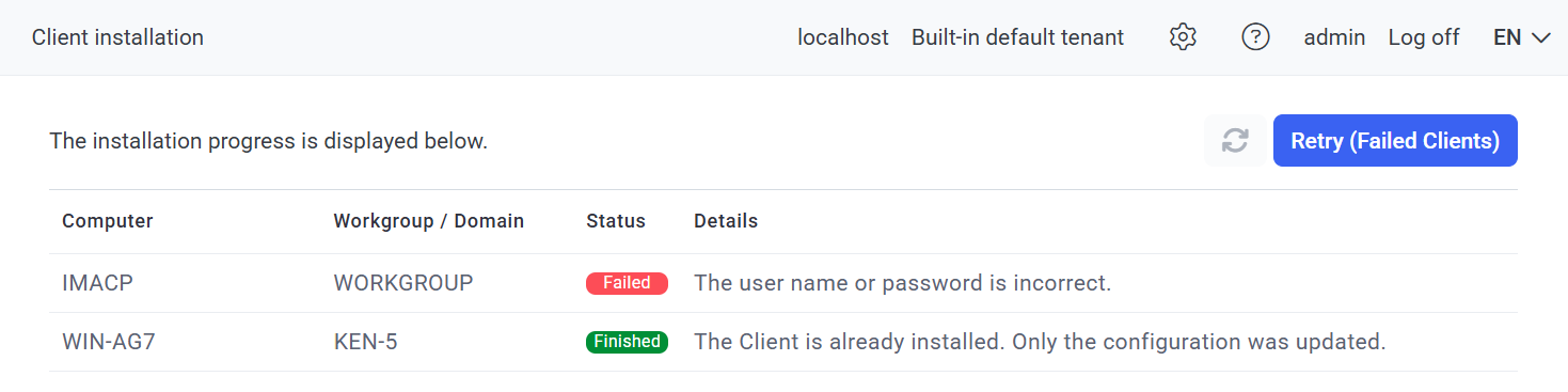5. In case the installation of any Clients fails, Failed is displayed in the Status column along with the reason for failure in the Details column, and the Retry (Failed Clients) button can be clicked to attempt to install them again.