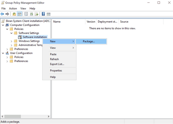 13, Right-click Software installation, and in the context menu, select New > Package.