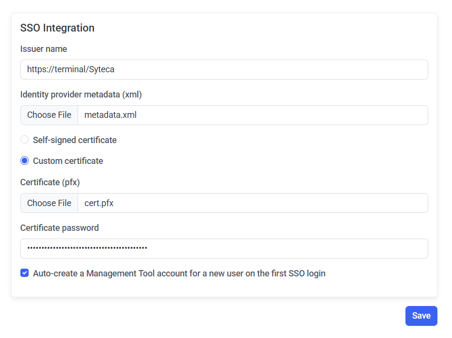 3. The Auto-create a Management Tool account for a new user on the first SSO login checkbox is selected by default, which automatically creates an internal / Active Directory user account in the Management Tool on a user's first login using SSO authentication if the user has not previously been added to the Management Tool, thereby enabling them to log in. This checkbox can be deselected, so that users who have not previously been added to the Management Tool are not added automatically, and are not therefore able to log in.