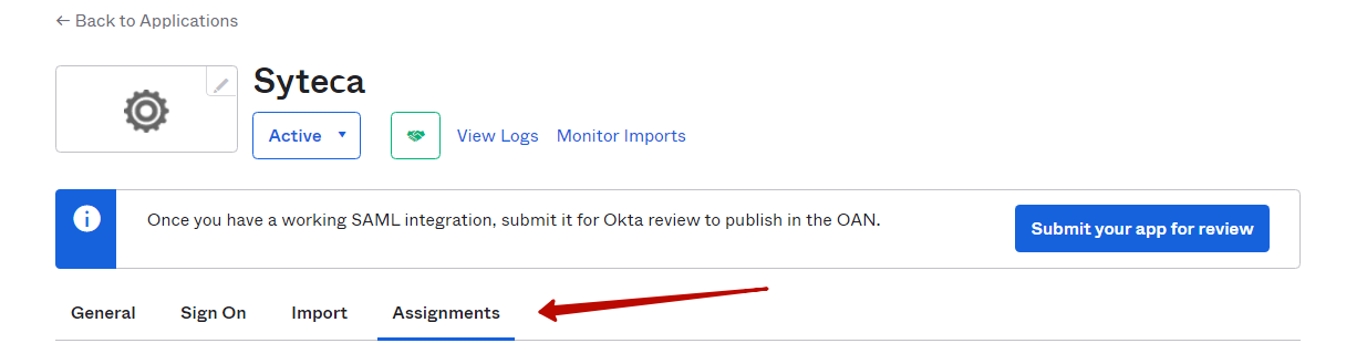 9. On the previous page, scroll up and open the Assignments page (by clicking Applications > Application > <your application> > Assignments).