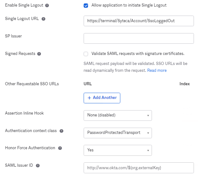 b) Replace the example "https://terminal/Syteca/" part of the URL (shown in the screenshot below) with the URL of your Management Tool in the Single Logout URL field.