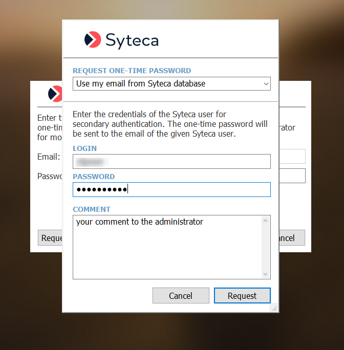 • If the Automatically send one-time passwords to internal users checkbox is enabled, the following pop-up window is displayed, where the user needs to enter their internal Management Tool user Login name and Password, and then click the Request button.