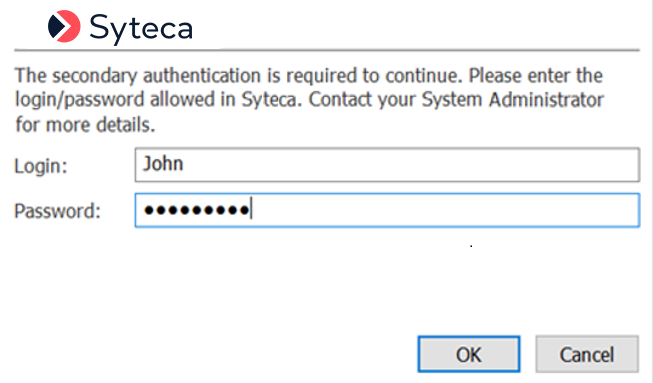 3. The user enters the credentials of a Syteca user that has the Access to Endpoint via Secondary Auth. permission for Clients.