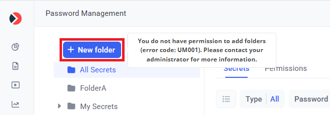 On the Password Management page (on the Secrets tab), the following error is displayed when attempting to add secrets or folders: "You do not have permission to add secrets (error code: UM001)). Please contact your administrator."