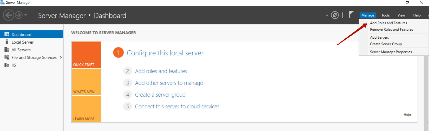 2. Open Server Manager, and then click Manage, and select Add Roles and Features in the drop-down list.