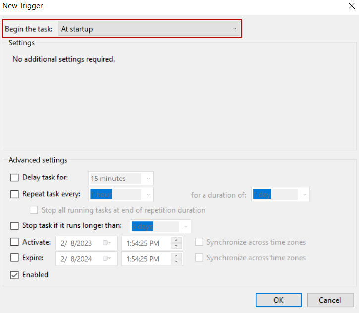 15. In the Begin the task field, select the At startup option from the drop-down list, and then click OK to apply the changes.