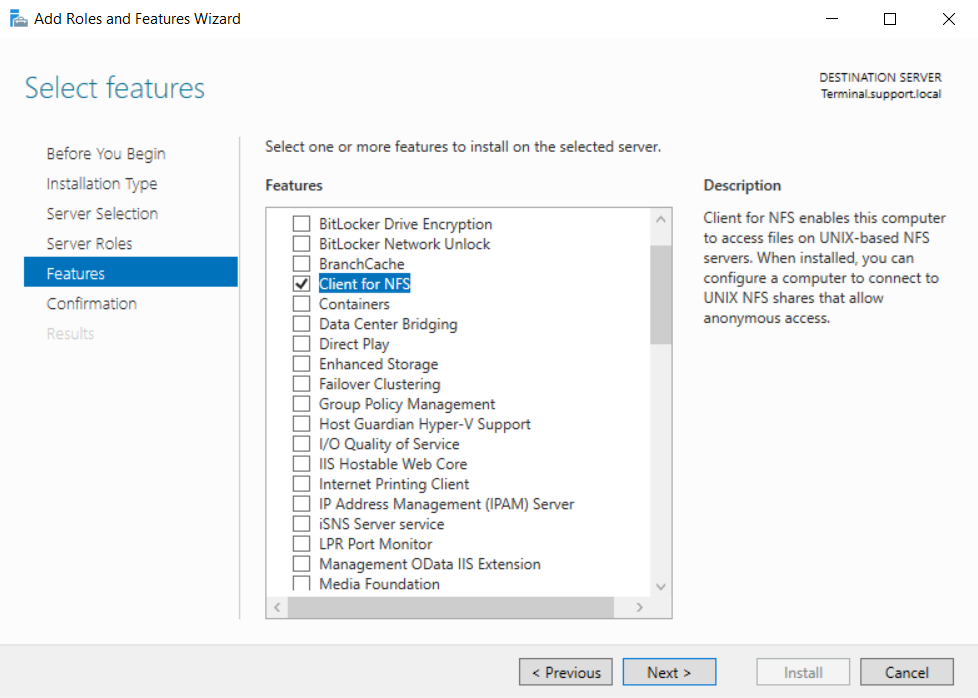 3. Select Features, and then select the Client for NFS checkbox to enable this feature.