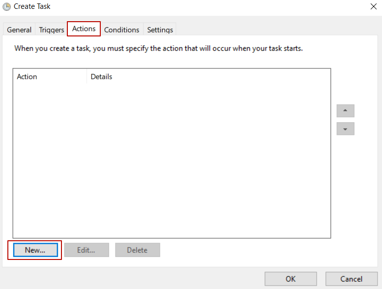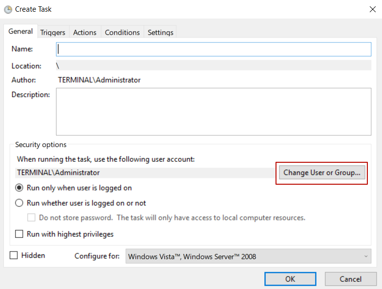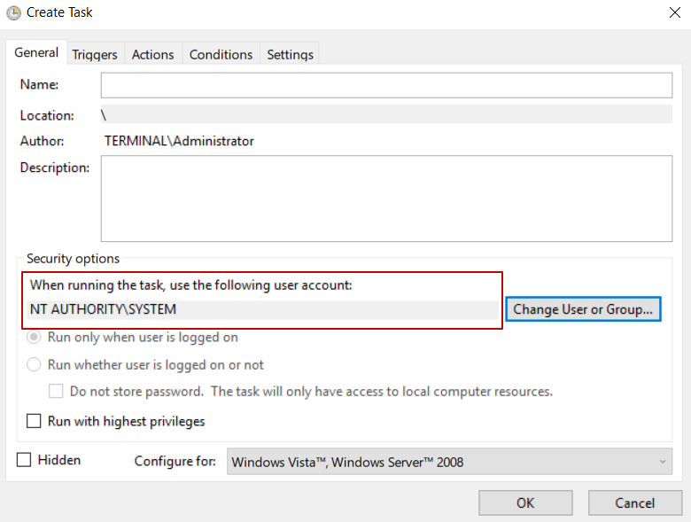 11. Enter SYSTEM in the Enter the object name to select (examples) field, and click OK to apply the changes (you will then see NT AUTHORITY\SYSTEM in the When running the task, use the following user account field).