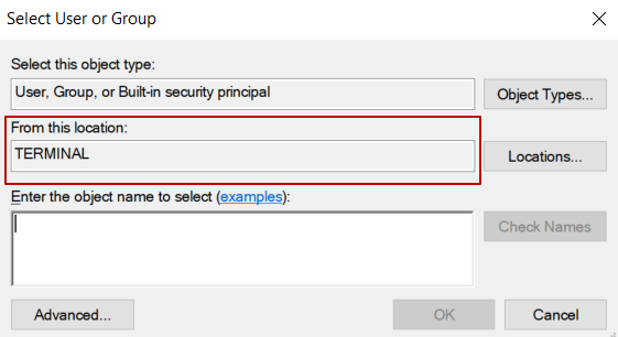 10. Make sure From this location is set to the local computer name (to change it, click the Locations button, and select the local computer name).