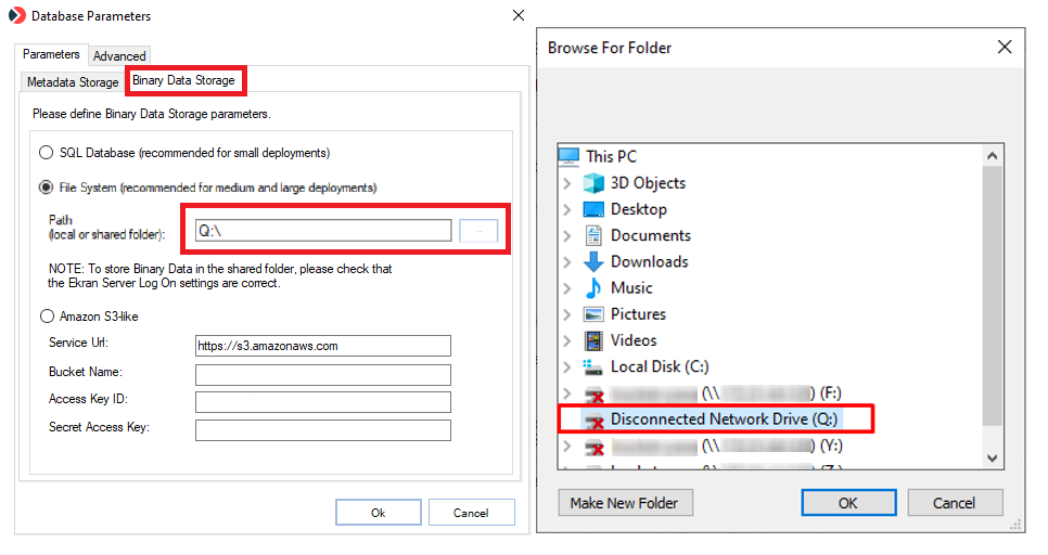 3. In the Database Parameters (DbSetupToolUI) application that opens, select the Binary Data Storage tab, and then select the mounted disk in the File System > Path field.