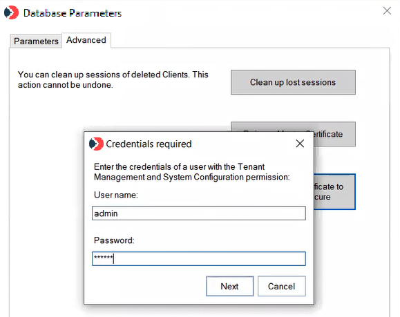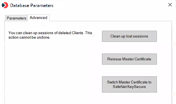 • The Master Certificate can no longer be reissued (by using the Reissue Master Certificate button on the Advanced tab of Database Parameters (DbSetupToolUI) application).