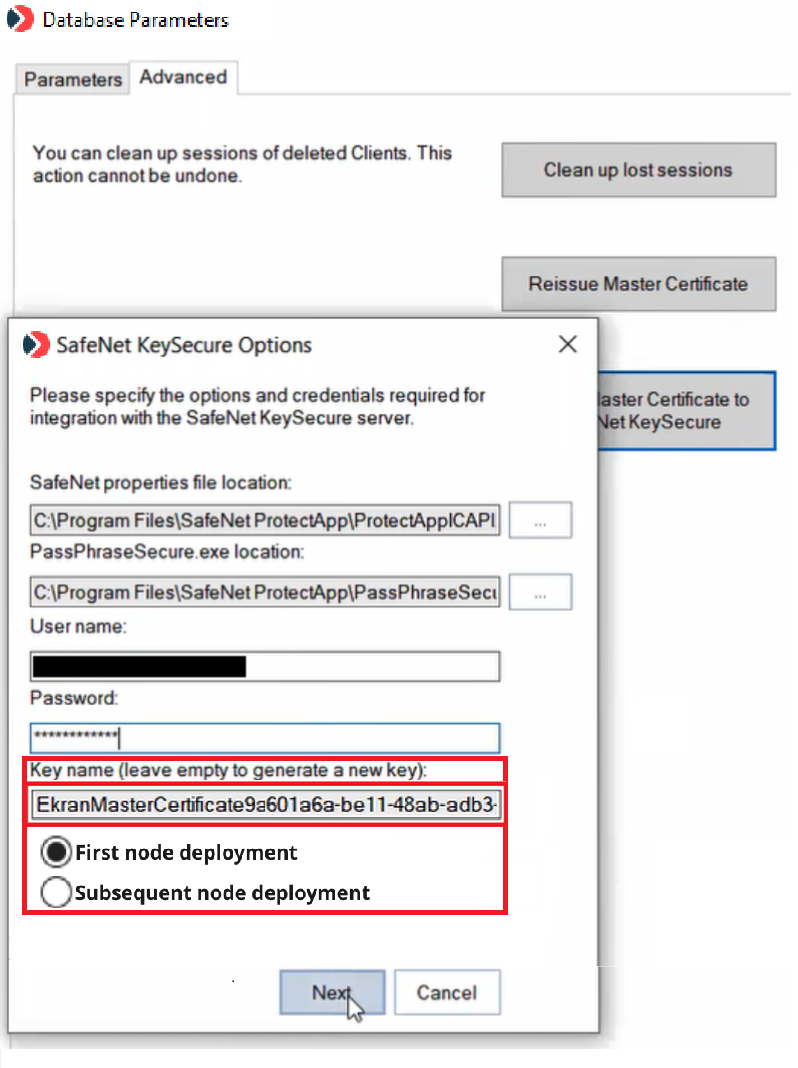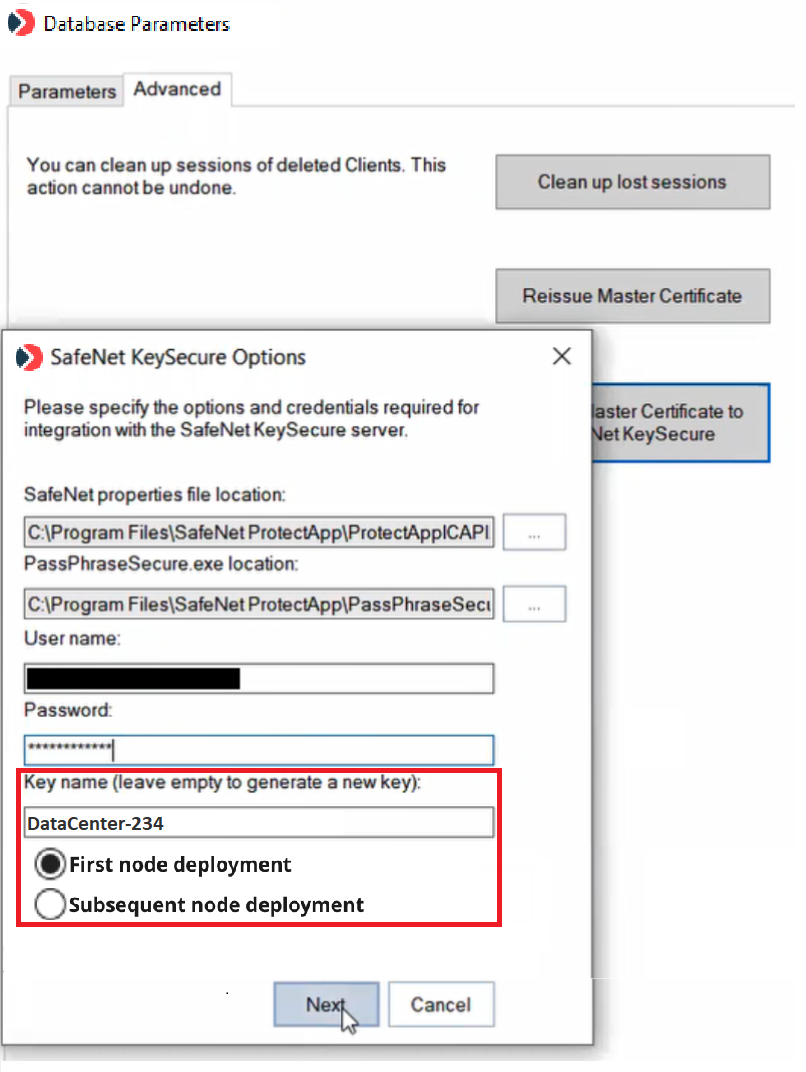 For large deployments with multiple Application Servers instances in a cluster, the process is the same as described above, but for each additional Application Server, the key needs to be copied from the Key name field (on the Advanced tab of the Database Parameters (DbSetupToolUI) application) on the node with the first instance of the Application Server, and pasted into the Key name field in the SafeNet KeySecure Options pop up window on the additional Application Server node (instead of leaving this field empty), and the Subsequent node deployment option then needs to be selected.