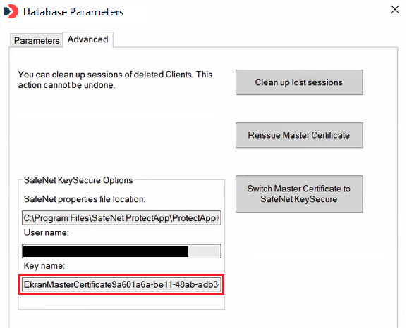 To enhance security, the Syteca Master Certificate (EkranMasterCertificate) can be moved to a Thales HSM (hardware security module) external storage device by using Thales SafeNet KeySecure with SafeNet ProtectApp.