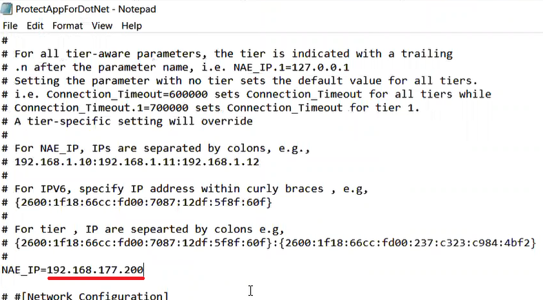 2. Scroll down to the line containing just "NAE_IP=", and immediately after this text, add the IP address of the machine where the SafeNet KeySecure keystore application is installed.