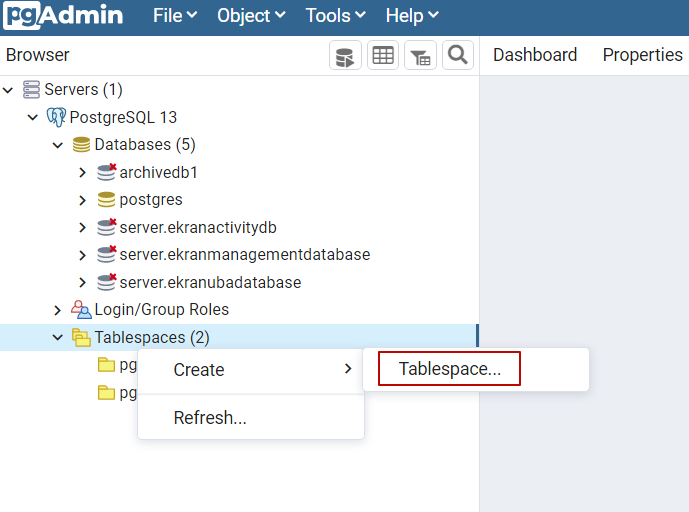 4. Open pgAdmin, and right-click on the Tablespaces section, and then select Create > Tablespace…