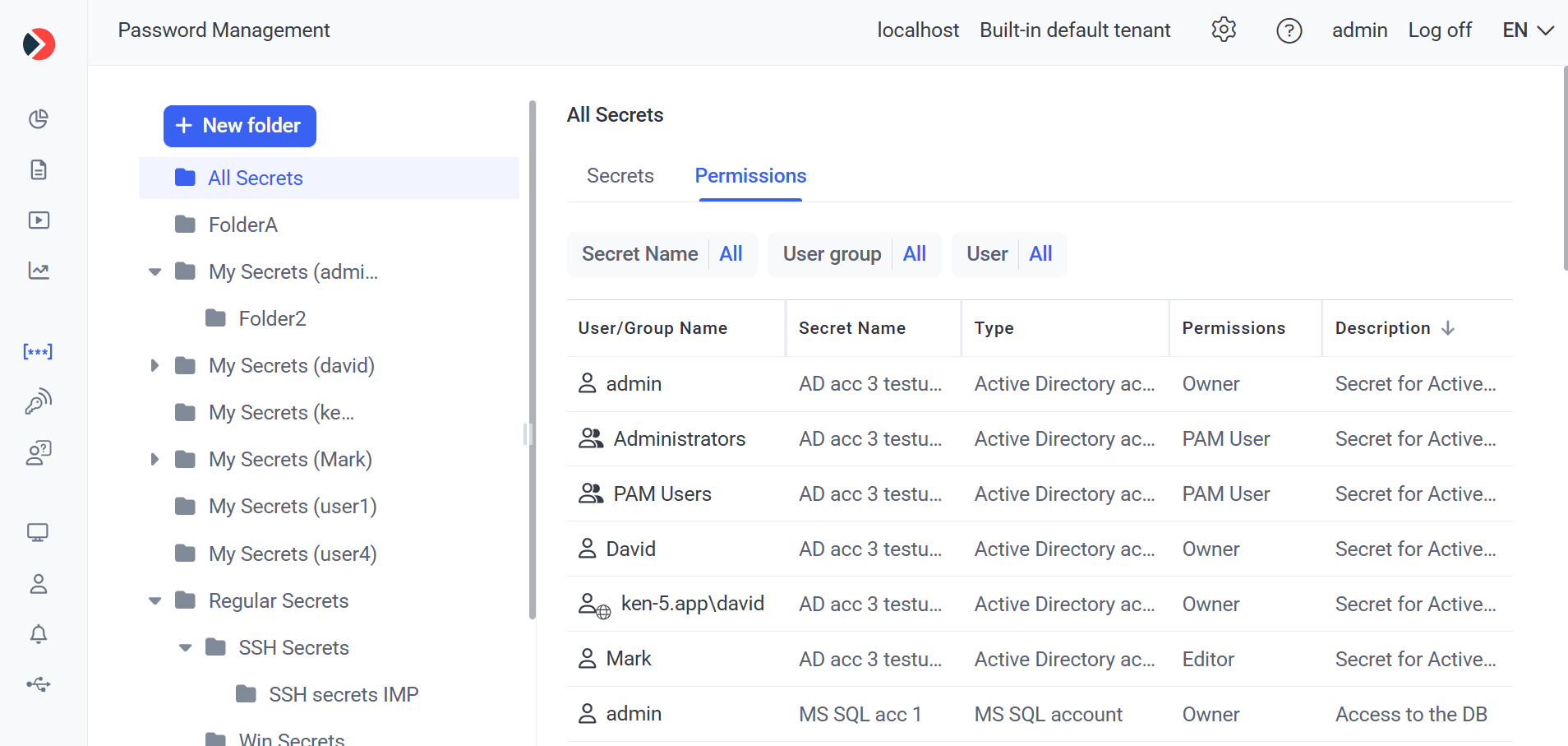 • Secret Name: Allows filtering of the permissions by the specific name of a secret for which the permissions are granted.