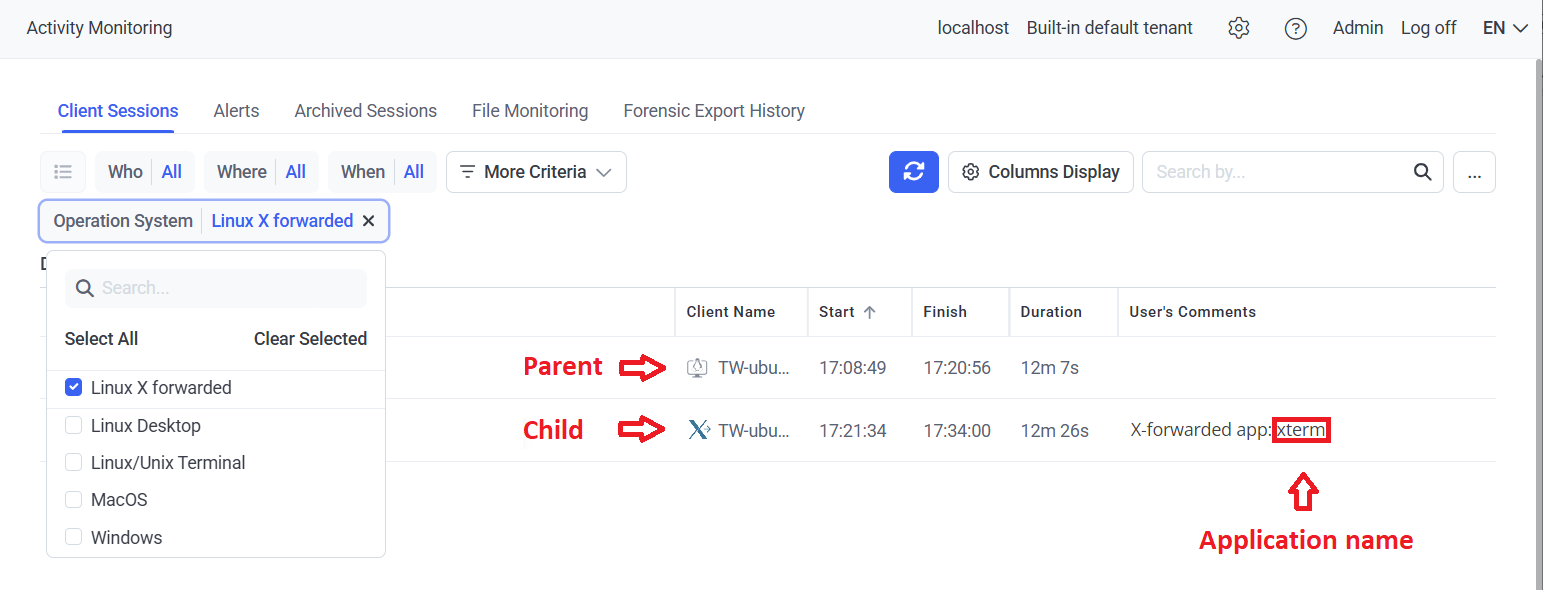 • The Linux X forwarded option in the OS filter can be used to display only X-forwarded sessions.