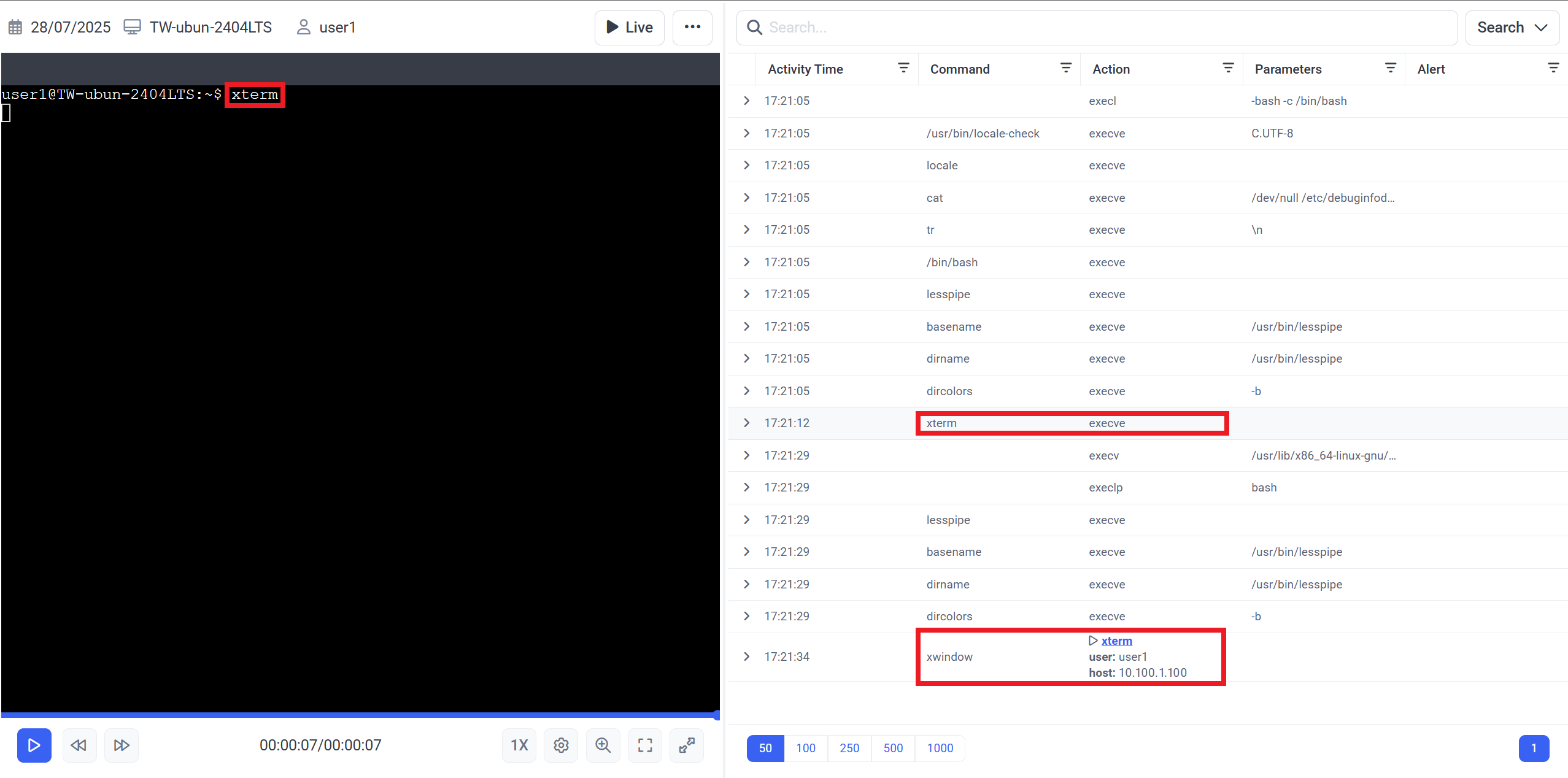 NOTE: The Search box on the Activity Monitoring page can be used to find records for the required X-forwarded sessions (e.g. in this case by entering "xterm" to display all sessions for that application name).