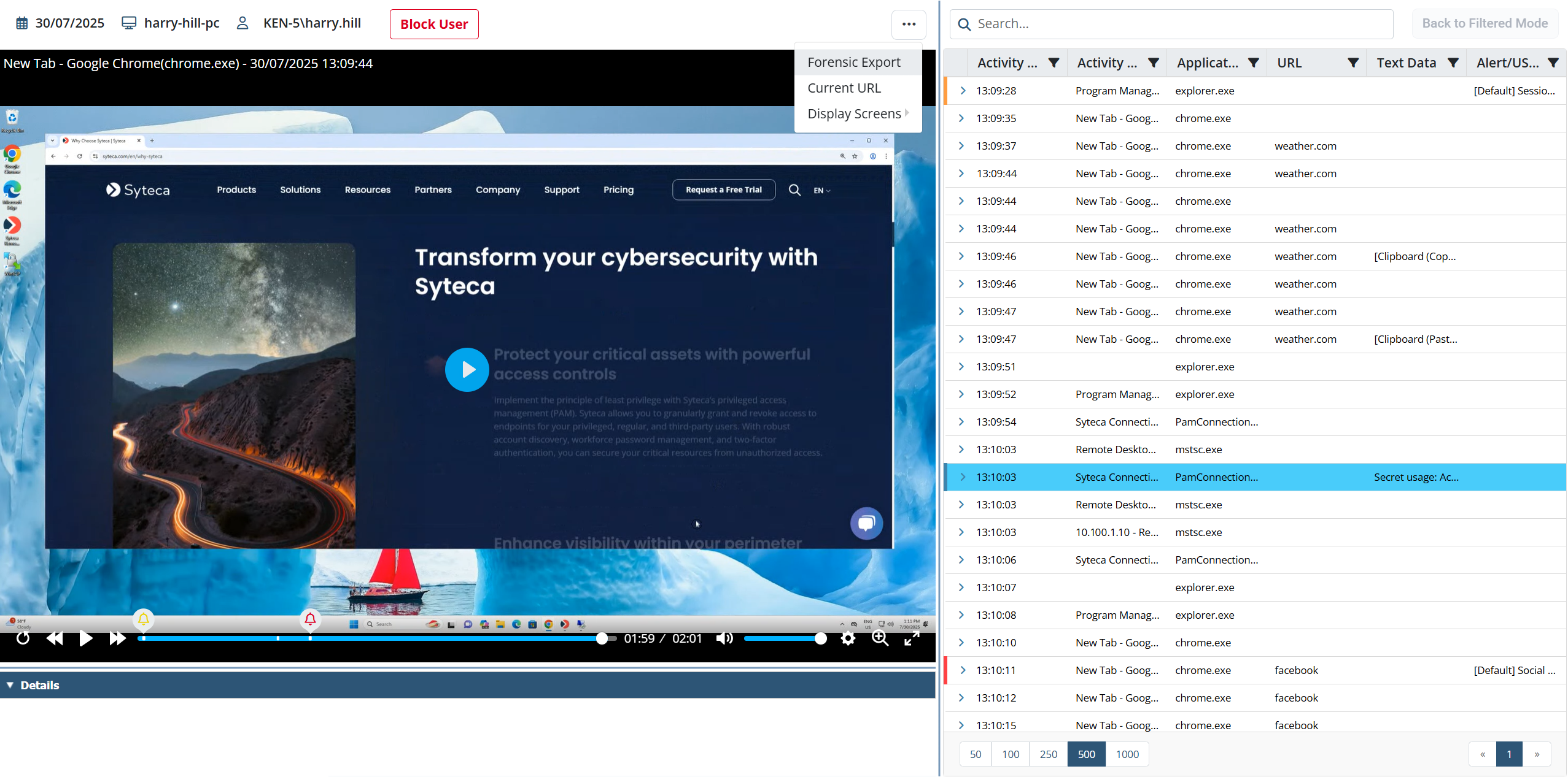 While playing Windows Client sessions, the screen captures / video of user activity recorded can be viewed in the Session Player, along with the associated metadata (Activity Time, Activity Title, Application Name, URL, Text Data (for keystrokes, clipboard operations, or file upload operations), and Alert/USB Rule) in the Metadata grid.