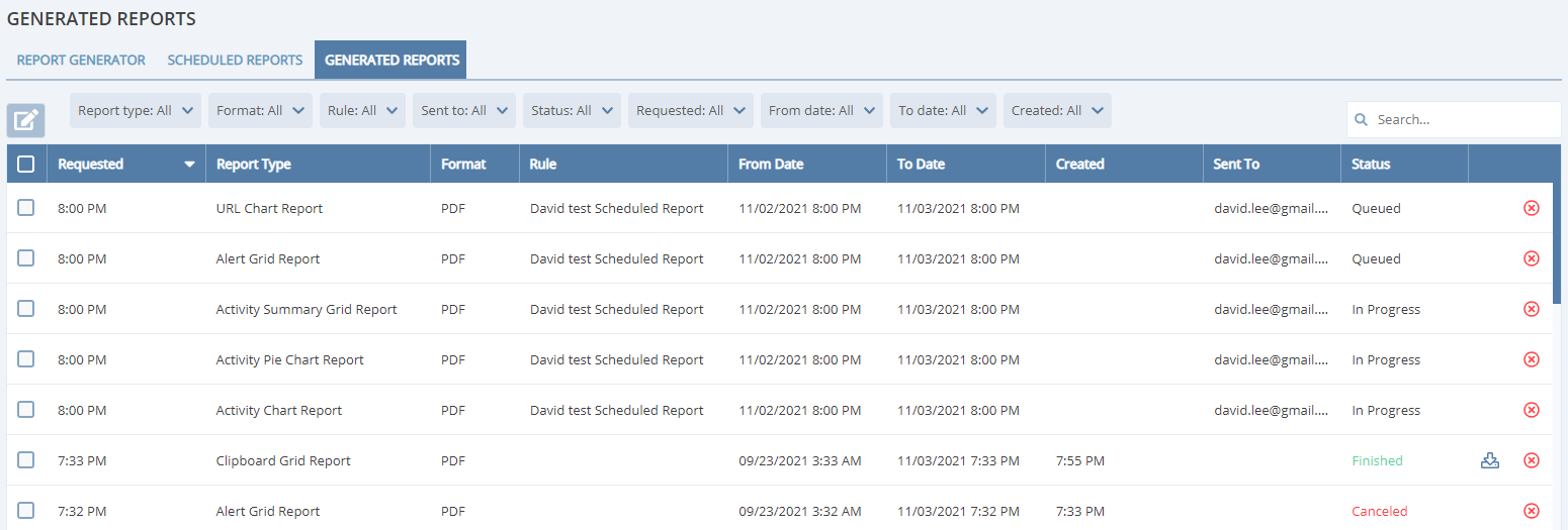 NOTE: If a scheduled report contains multiple report types, each type of report is sent in a separate email.