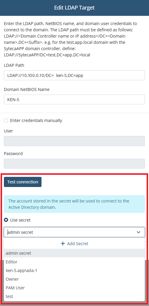 • [LDAP Targets:] The account (credentials) used in LDAP targets can now be stored in a Password Management secret (e.g. to improve security).