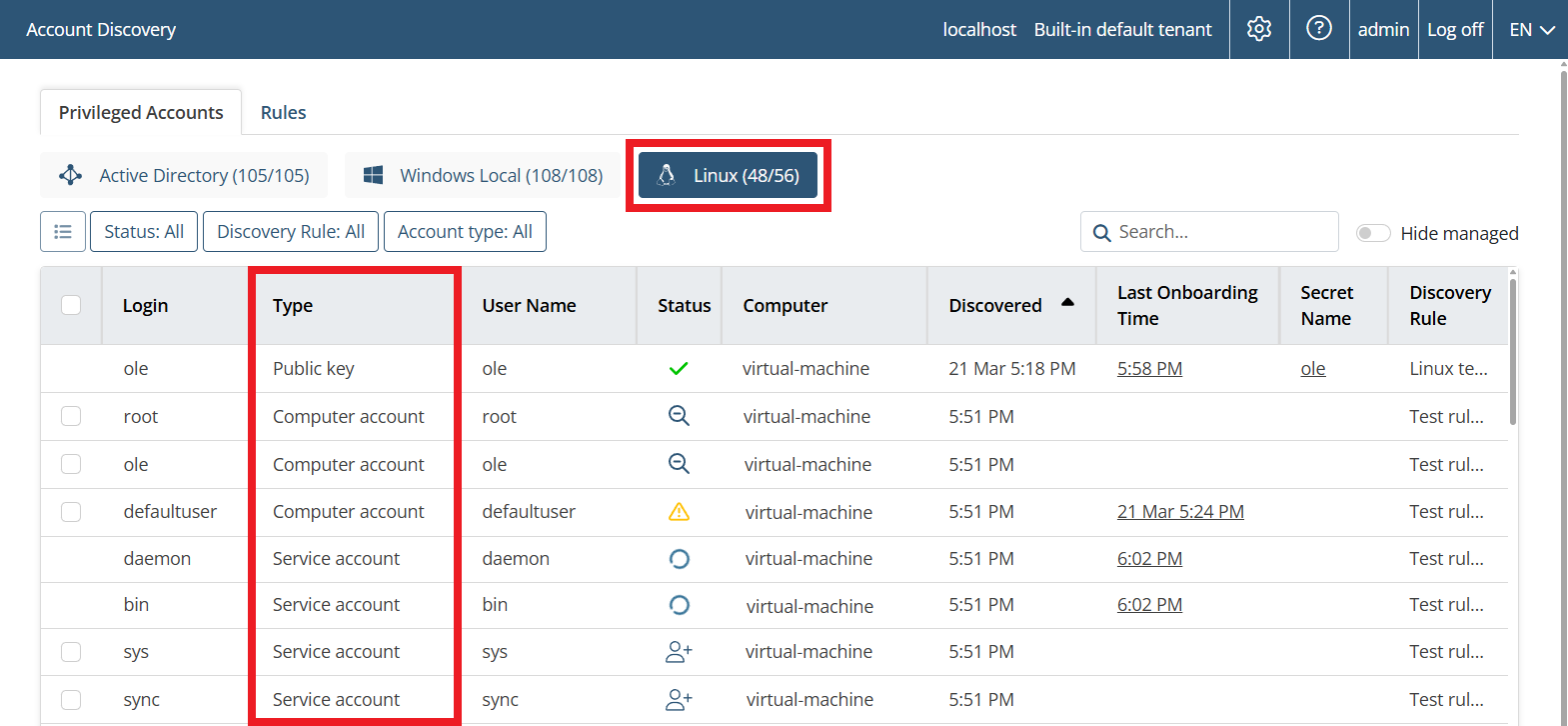 • [Account Discovery (PAM):] Linux account discovery is now available, after configuring SSH connections to scan and onboard various types of Linux accounts.