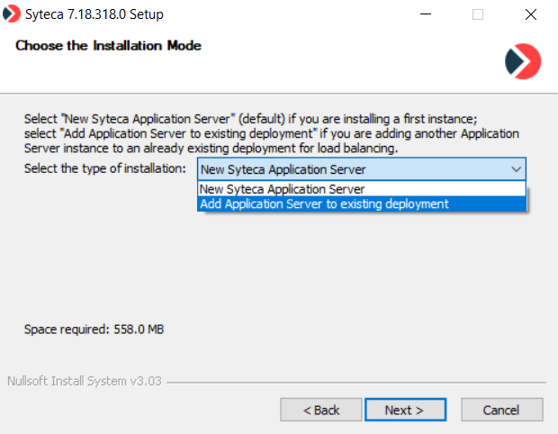 5. On the Choose the Installation Mode page, if this is the initial installation of the Application Server, make sure that the New Syteca Application Server option is selected, and then click Next.
