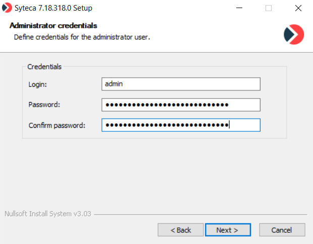 14. On the Administrator credentials page, define the credentials to be used for the administrator user of Syteca (i.e. the admin user of the built-in default tenant, who has full system permissions) in the corresponding fields as follows, and then click Next: