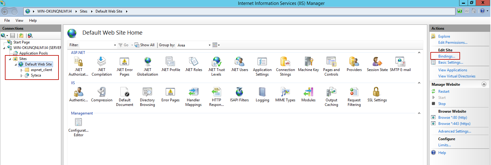 3. In the Actions pane (on the right), click the Bindings navigation link to open the Site Bindings window.