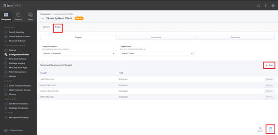 4. Select the Scope tab, then click the Add button on the right and select those computers where you want to install mobileconfig, and then click the Save button (in the bottom right).