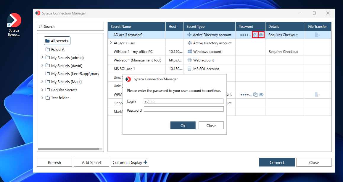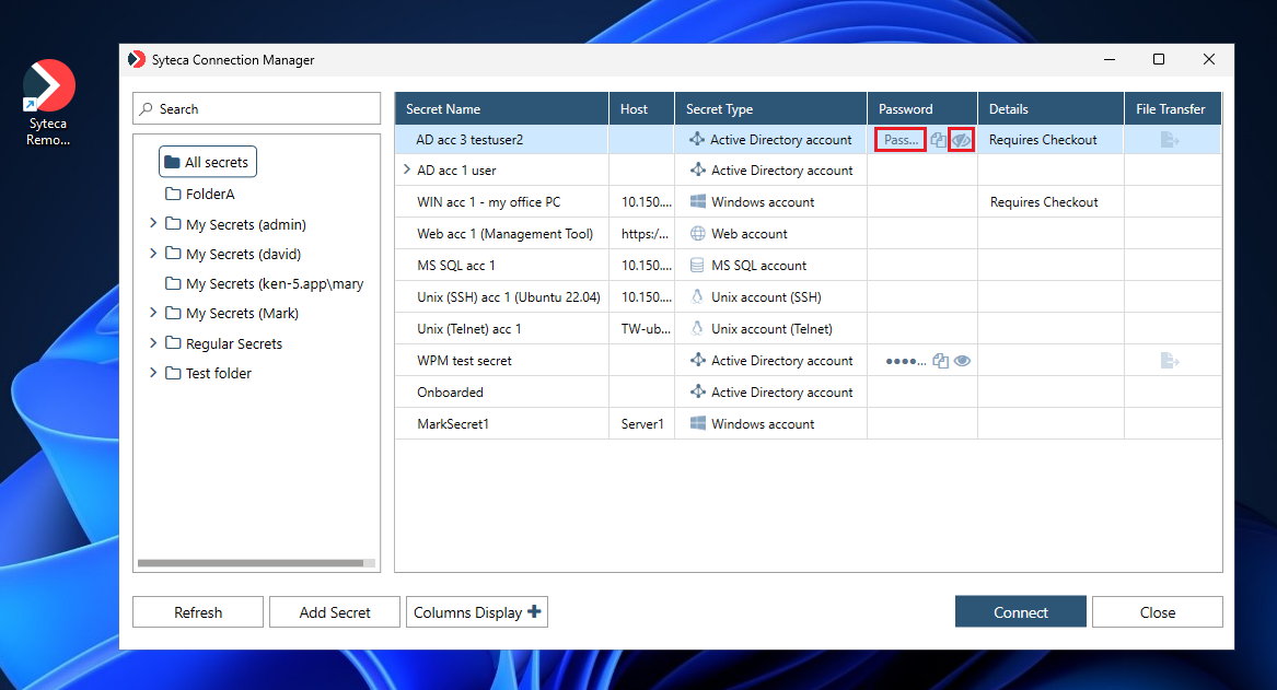 To view and/or copy a secret's password in Syteca Connection Manager, do the following: