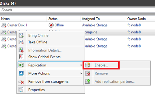 2. On the list of available disks, right-click on the disk that was assigned to the File Server role, and then select Replication and then Enable.