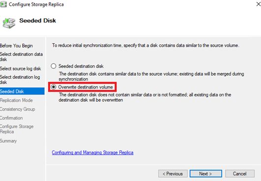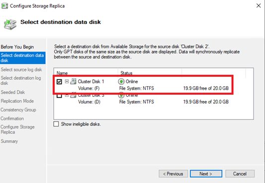3. In the Configure Storage Replica wizard, on the Select destination data disk page, select the disk which you want the data to be replicated to.