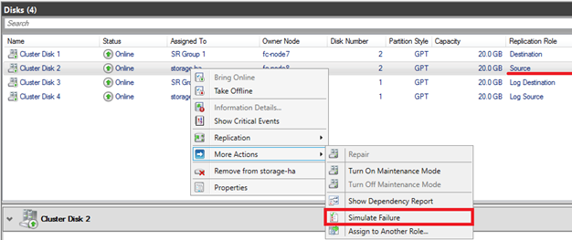 To simulate a failure you can use the Simulate Failure option for the current source disk.