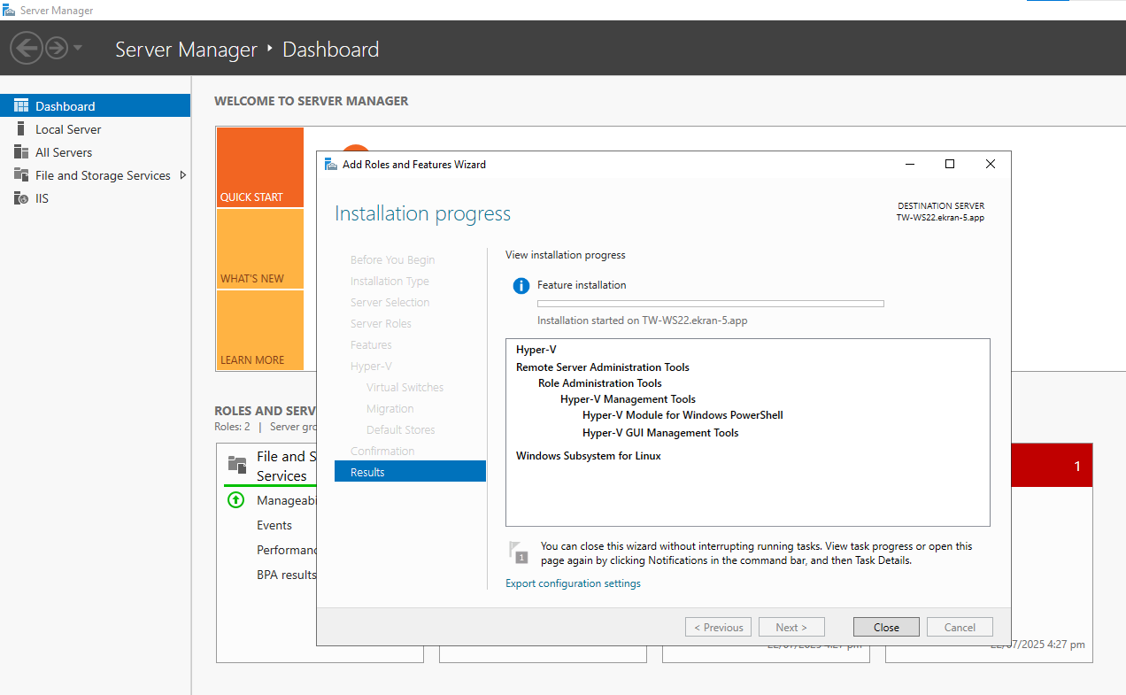 1. Use Windows Server Manager to install the WSL feature and Hyper-V role (to be able to enable the Enable Syteca Web Connection Manager toggle, so as to use the Launch in browser option), as shown in the following screenshots (examples using Windows Server 2022):